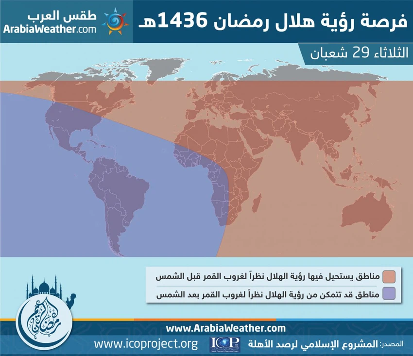 موقع ArabiaWeather.com- من المُنتظر أن تبدأ الدول العربية و الإسلامية بتحري هلال شهر رمضان المُبارك للعام 1436هـ، وذلك مع مغيب شمس يوم الثلاثاء 29 شعبان 1436هـ، الموافق 16/6/2015م، إحياءً لسُنة النبي صلى الله عليه وسلّم في معرفة بداية الشهر الفضيل.