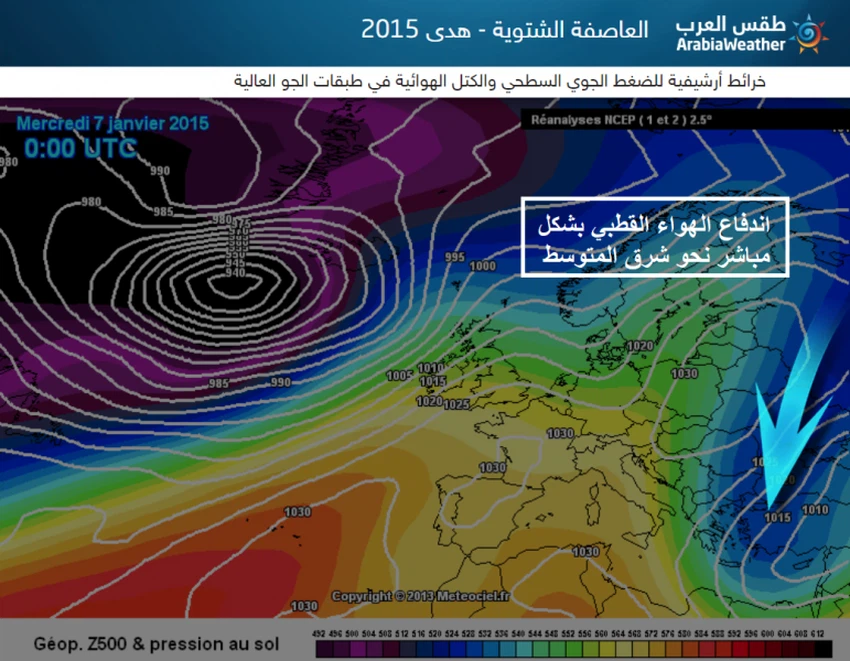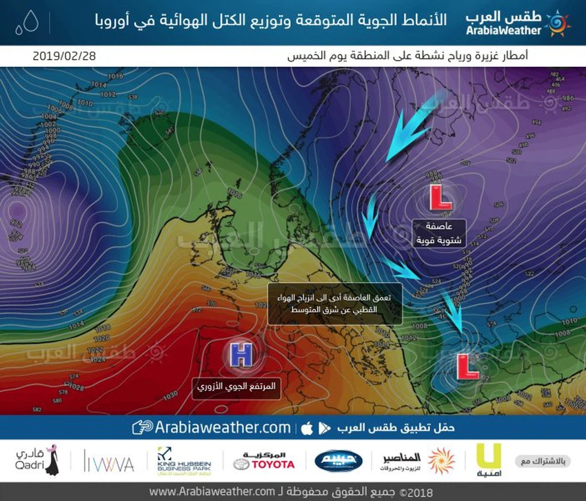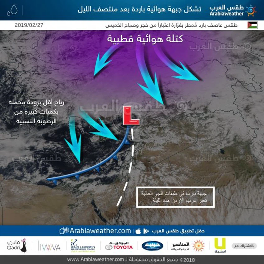 الوضع العام || وفي حالتنا هذه، قد اندفاع بالفعل مرتفع جوي قوي نحو غرب أوروبا، تزامن ذلك مع اندفاع كتلة قطبية شديدة البرودة شرقاً، وتسرب جزء من الهواء البارد نحو شرق المتوسط وبلاد الشام، مما أدى الى تشكل منخفض جوي مرفقاً بمسار ممتاز / مثالي للسحب الماطرة نحو المملكة والتي بدأت يوم الأربعاء ويتوقع أن تستمر وتشتد يوم الخميس.