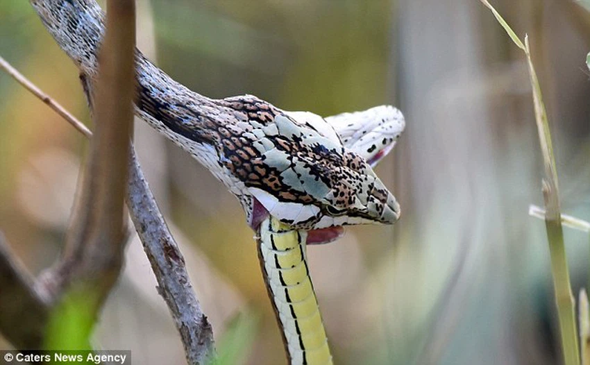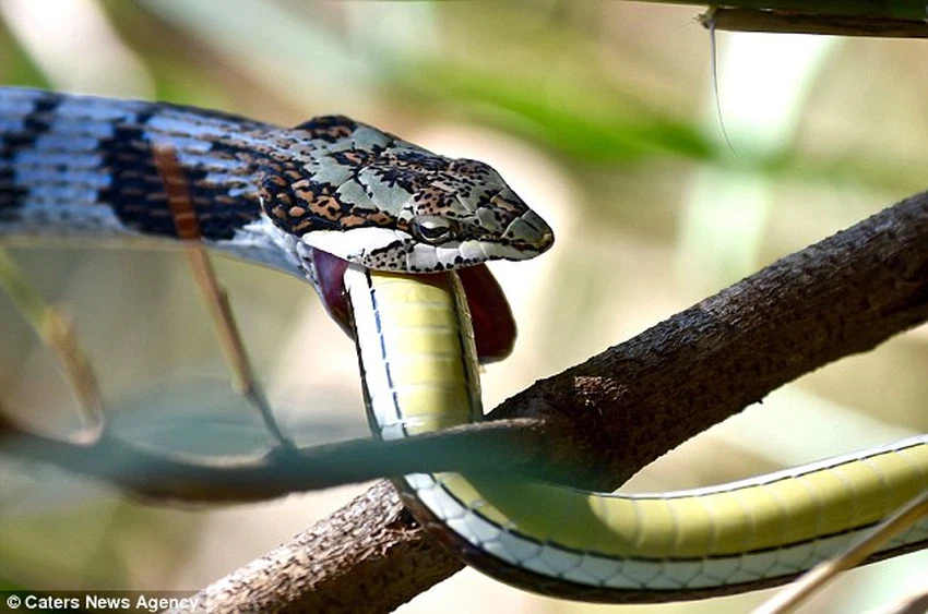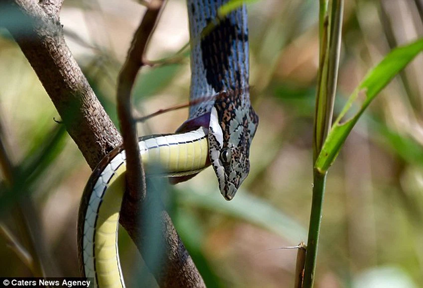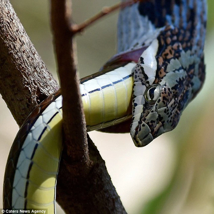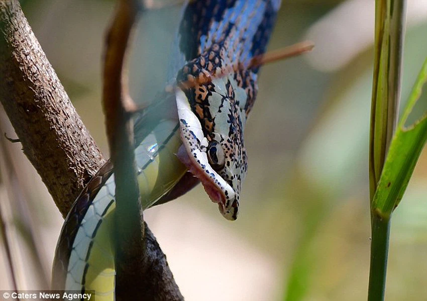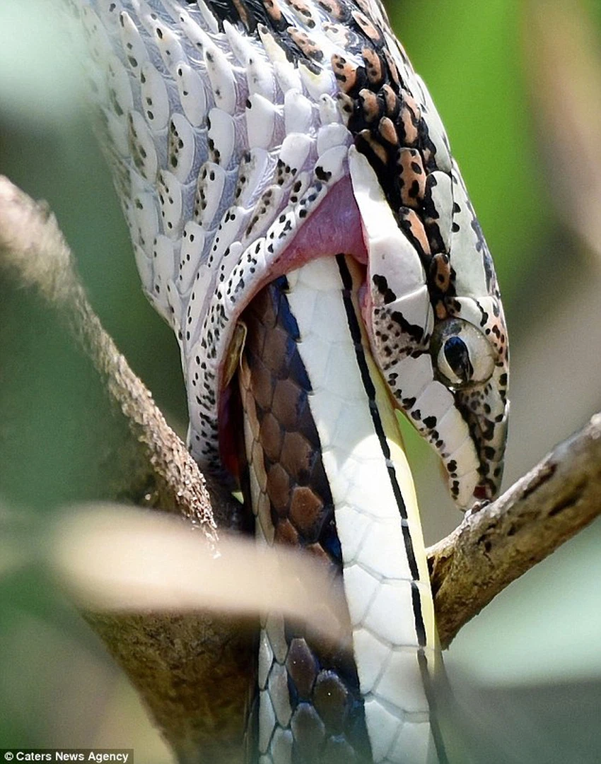 وتضمنت الصور التهام ثعبان الكرمة، أفعى وابتلاعها في غضون ساعة كاملة، بعد أن اصطادها من رأسها، وبث سمه فيها ليقتلها قبل الشروع في التهامها.
