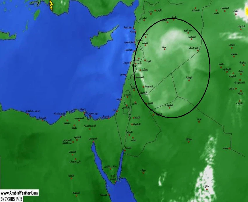 تُشير صور الأقمار الاصطناعيّة المُستلمة لدى "طقس العرب" إلى تواجد موجة قويّة من الغُبار في كُل من العراق وسوريا ولبنان والأجزاء الشرقية من الأردن والتي بدأت بدورها بالدخول نحو أجواء أقصى شمال السعودية وهي تُسبب تدنّي واضح في مدى الرؤية الأفقية.