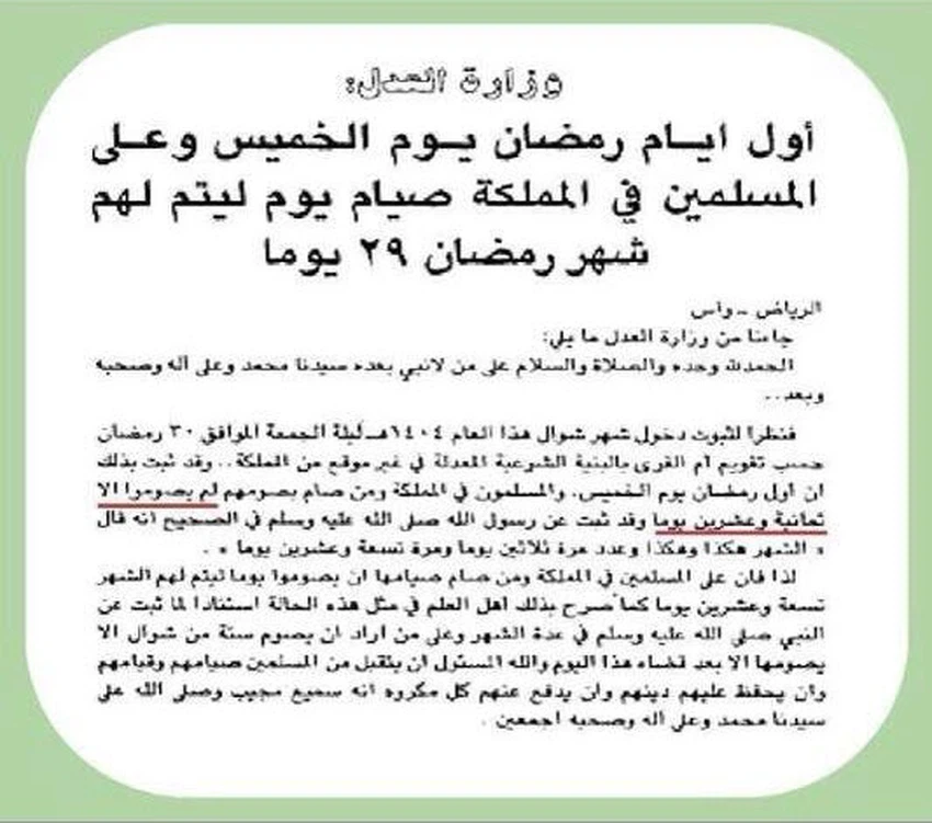 فطالب عموم المواطنين في ذاك الوقت بقضاء يوم وذلك قبل نهاية شوال، بحسب فتوى الشيخ عبد العزيز بن عبد الله بن باز التي صدرت آنذاك، وهذه بعض الوثائق النادرة التي حصل عليها موقع "ArabiaWeather.com":