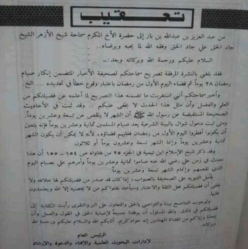 مراسلة نادرة بين فضيلة الشيخ عبد العزيز بن عبد الله بن باز إلى سماحة شيخ الأزهر في مصر