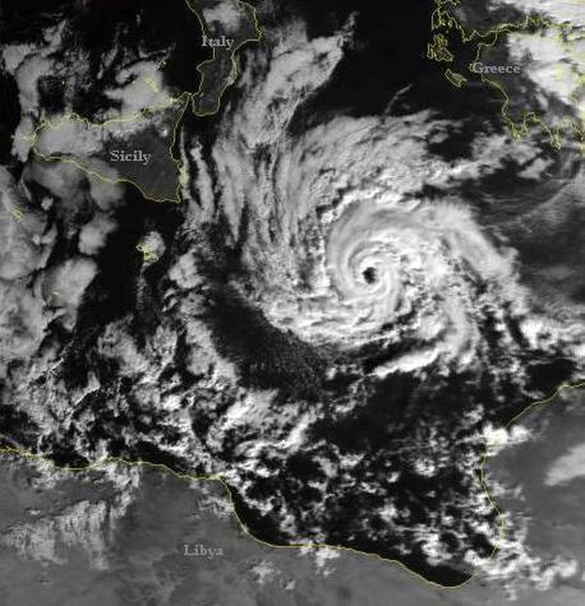 ولعلّ أوضح الأمثلة على هذه الظاهرة، هو ما حدث في منتصف شهر يناير/كانون الثاني من العام 1995، حينما تشكّل إعصار في وسط البحر المتوسط، في المنطقة البحرية بين إيطاليا واليونان وليبيا.
