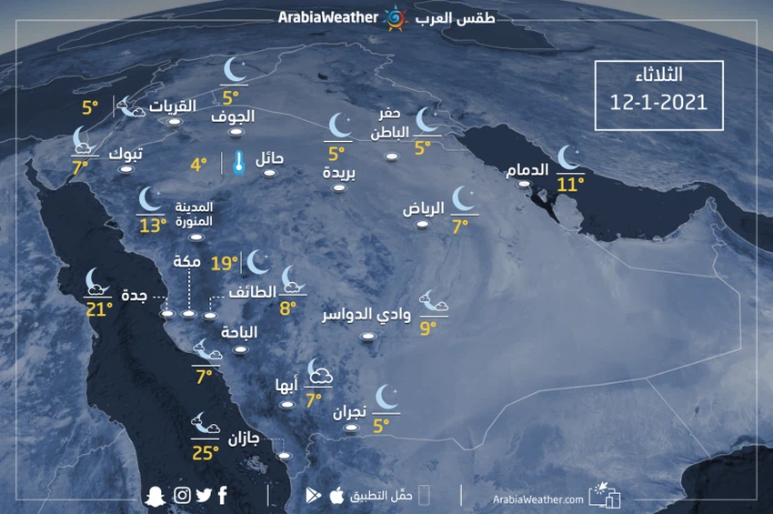 حالة الطقس ودرجات الحرارة المتوقعة في السعودية يوم الثلاثاء 12-1-2021