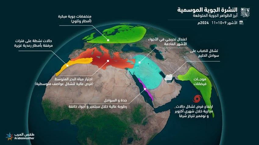 طقس العرب - سنان خلف - أصدر فريق التنبؤات الجوية في "مركز طقس العرب الإقليمي" قبل قليل توقعات الطقس بعيدة المدى، والخاصة بفصل الخريف 2024 وموسم الوسم في السعودية لهذا العام 2024م، وتشمل التوقعات الأولية لدرجات الحرارة وتوقعات الأمطار وانحرافها عن معدلاتها لأشهر (سبتمبر وأكتوبر ونوفمبر) على النحو التالي: