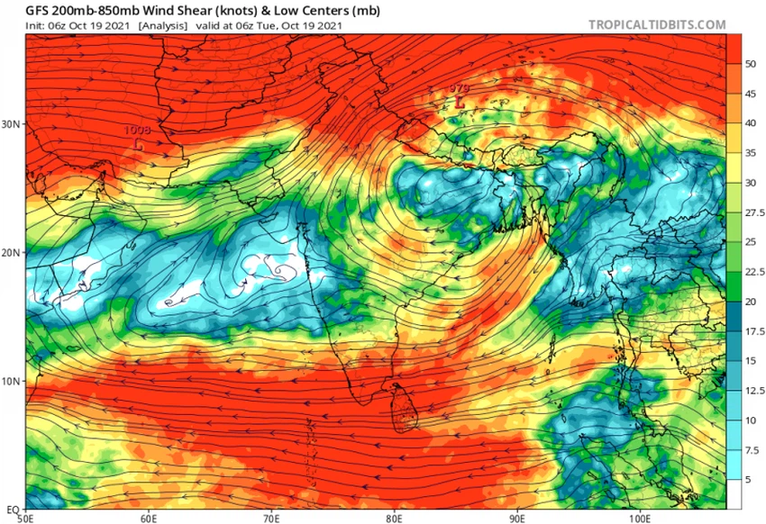 ومع انتصاف شهر أكتوبر ما زالت الشرقيات مُسيطرة على أجواء بحر العرب، التي تتسبب بانسحاب الرياح الموسمية بمشيئة الله، وما يُرافقها من ضعف واضح في نشاط رياح القص على معظم انحاء بحر العرب، مما يعني أن النظام المداري لو تكون سيكون بمقدوره التطور وزيادة النمو العمودي للسحب الركامية المُرافقة.