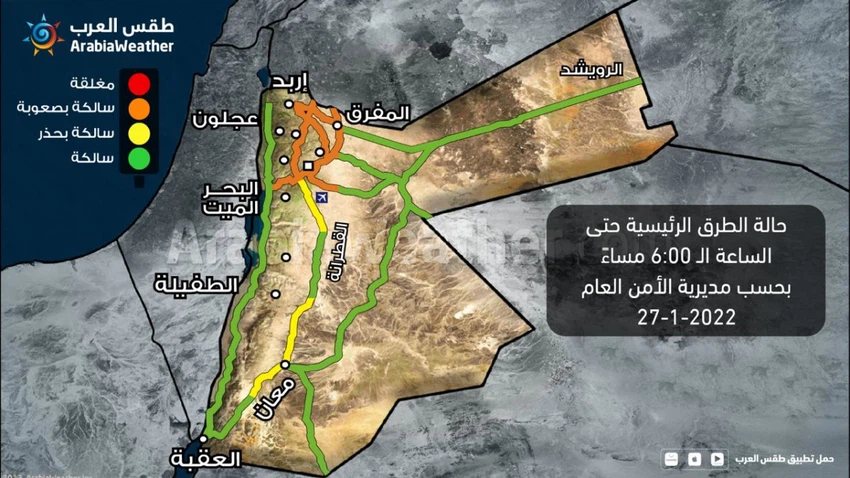 Arab Weather - The Public Security Directorate in Jordan announced the state of the roads until six o'clock in the evening, Thursday, 27/1/2022 as follows: