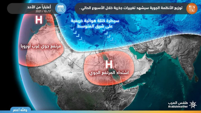In the details, it is expected that an autumn air mass will advance over the region, blowing the country with refreshing autumn breezes, so that mild autumn weather will prevail in the mountainous heights on Sunday, which will turn cold in the mountainous heights as of Monday. To northwesterly moderate speed, active sometimes and leads to raising dust, especially in desert and open areas.
