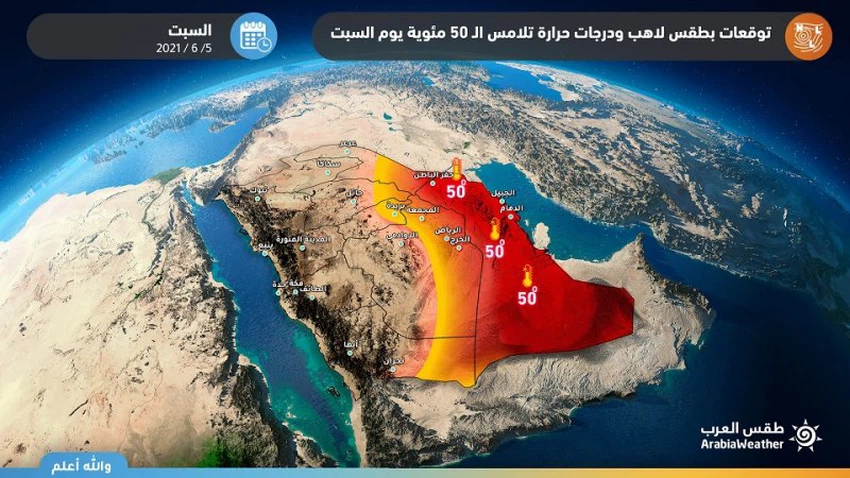 While Al-Ahsa is affected by north to northeasterly winds, with high temperatures, it is expected to touch 50 degrees Celsius on Saturday, as is the case in the general interior parts of the eastern region, as shown on the attached map.