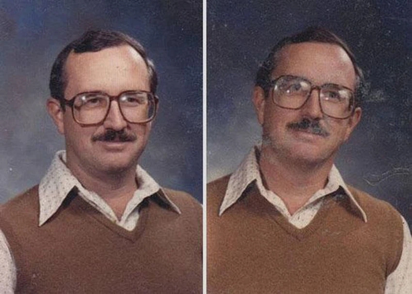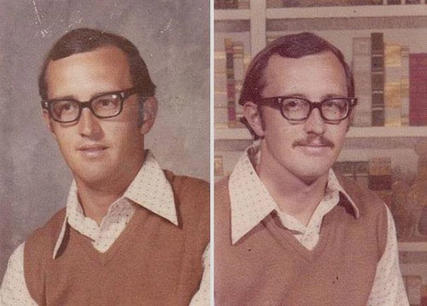 وتظهر الصور التي تم جمعها من الكتاب السنوي للجامعة تقدم عمر الاستاذ على مر السنين إلا أن الملابس بقيت كما هي دون اي تغيير.
