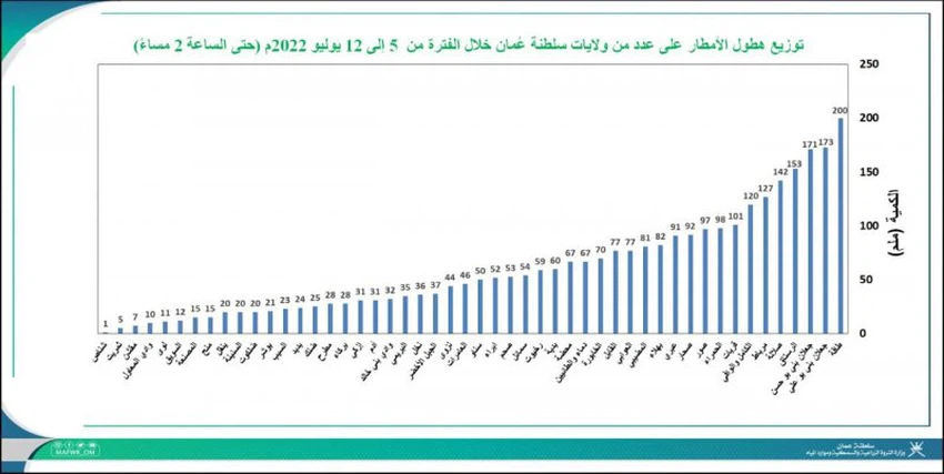 The data of the Ministry of Agricultural Wealth, Fisheries and Water Resources showed that the Wilayat of Taqa in the Governorate of Dhofar received record and exceptional amounts of rain for this time of the year by 200 mm. According to the same data and values, the Wilayat of Rustaq and its neighboring areas received large and quite rare amounts of rain at this time of the year, exceeding 150 mm, resulting in torrential rains in valleys and reefs. .