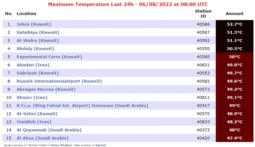 The eight Arab cities came from Kuwait, while the list included two cities located in Iran. The highest temperature in the world was recorded in Al-Jahra, Kuwait, where the temperature reached 52.7 degrees Celsius.
