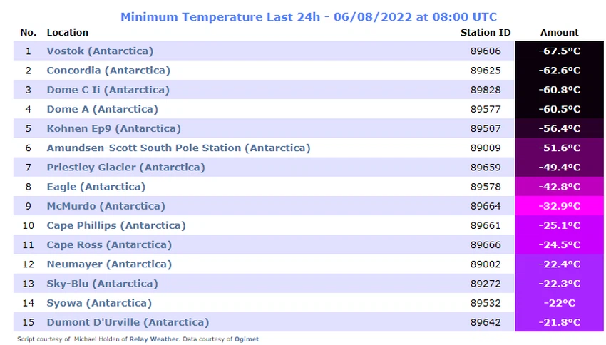 As for if you were curious to wonder about the lowest temperature recorded in the world during the past 24 hours, it was in Antarctica, at 67.5 degrees below zero degrees Celsius.