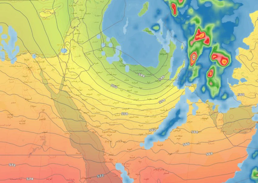As an explanation of the air system that will control the Arabian Peninsula and surrounding areas, a cold air depression is stationed over Iraq, pushing a cold air mass towards Bilad al-Sham and then towards northern Saudi Arabia, coinciding with the control of a relatively warm and humid air mass over central and southern Saudi Arabia.