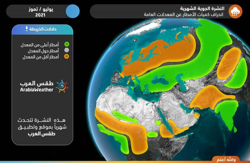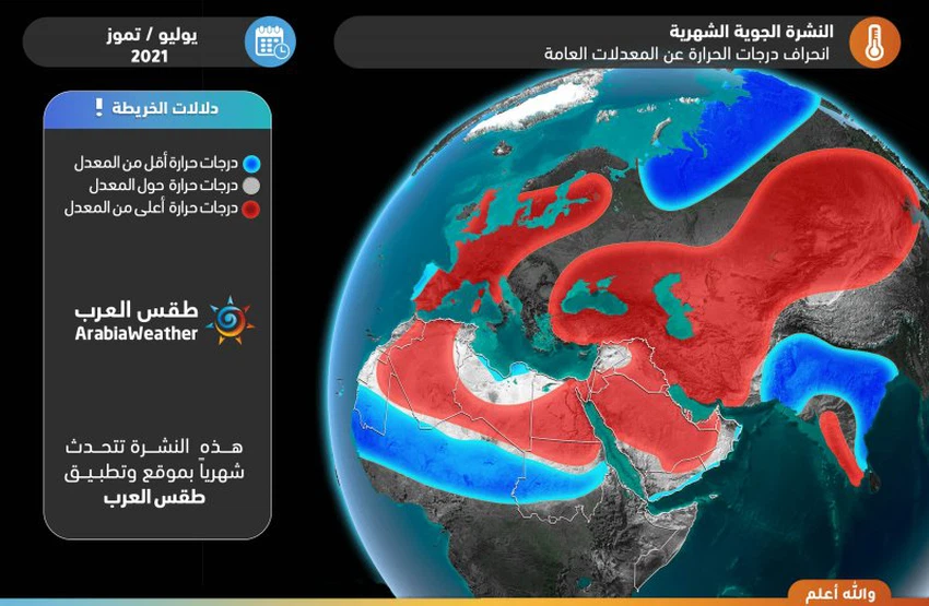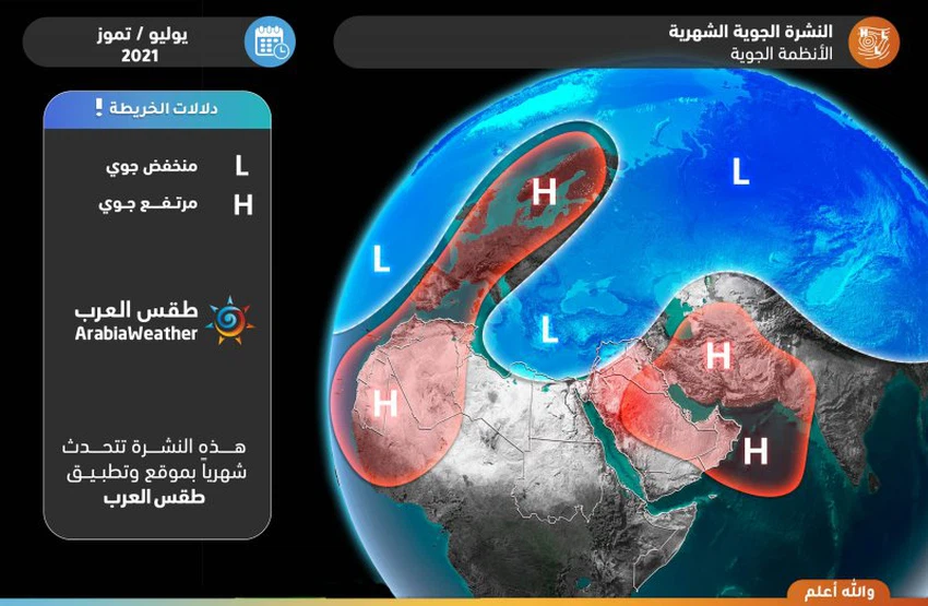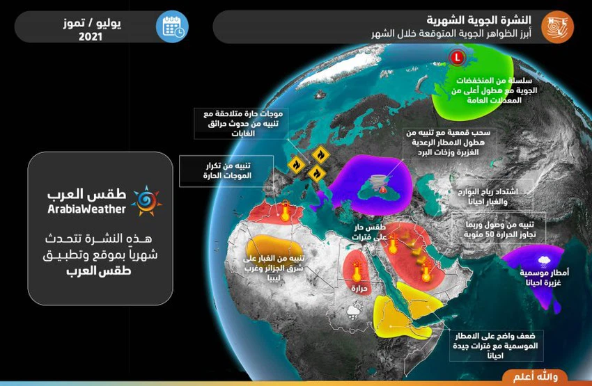 Weather of Arabia - Arab Weather provides you with the expected monthly weather forecast for the month of July 2021 .