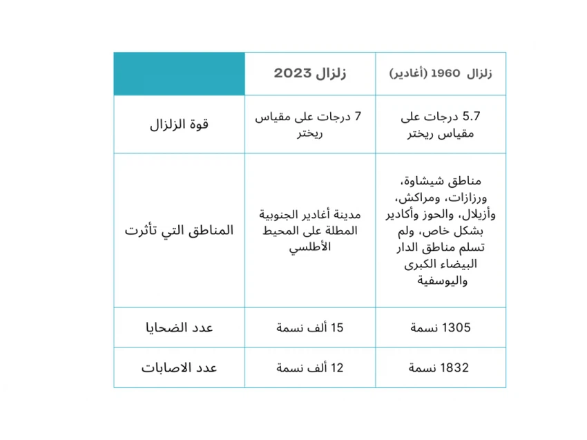 In 1960, in the city of Agadir, overlooking the Atlantic Ocean, the Agadir earthquake occurred, and it was the most deadly and destructive in the history of Morocco, with a magnitude of 5.7 degrees on the Richter scale, and the death toll of its victims was about 15,000 dead and 12,000 injured.