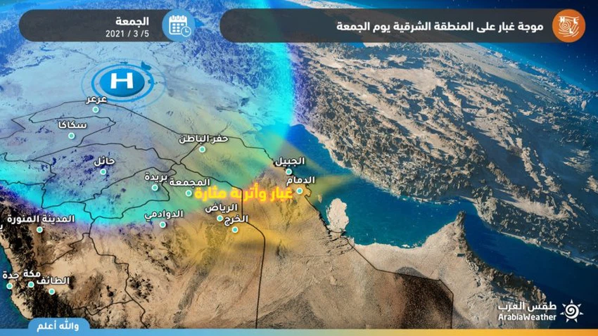 Arab weather - Sinan Khalaf - is affected in general by the eastern parts of the Kingdom, in addition to the capital, Riyadh, with hours on Friday morning, by crossing a cold air mass coming from the north towards the region's atmosphere. It is expected to be associated with remarkable and great activity on dusty and dusty winds.