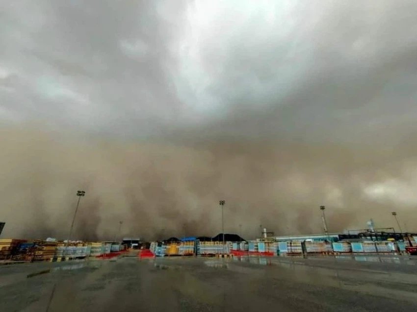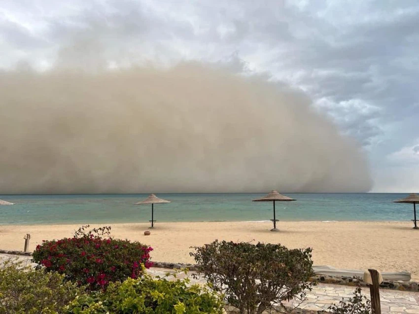A strong thunder cloud formed in parts of the Gulf of Suez on Tuesday afternoon, accompanied by heavy thunderstorms and the formation of strong descending air currents towards the surface of the earth, which caused remarkable activity and great activity on the movement of surface winds, which resulted in dust in the form of a sandstorm.