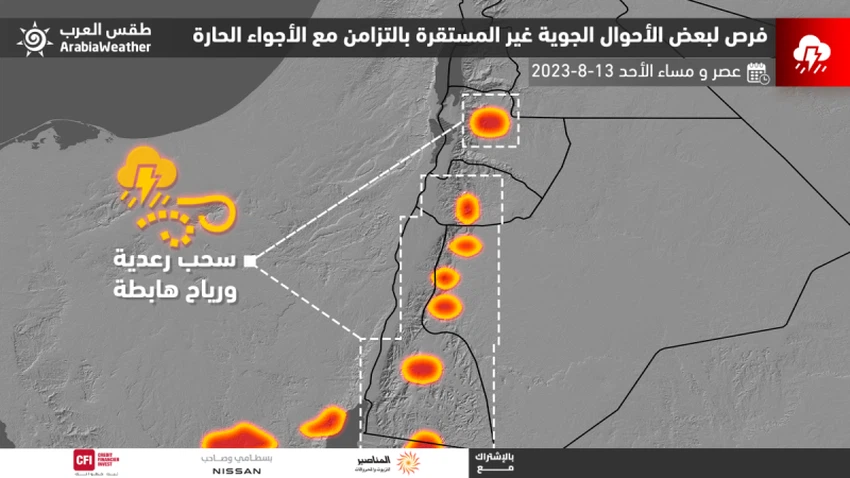 Weather of Arabia - Despite the very hot weather that the Kingdom is exposed to, weather maps indicate that the opportunity is ripe with the afternoon and evening hours on Sunday for local showers of rain, God willing, in some regions of the Kingdom, especially the city and governorate of Aqaba, the heights of Al-Sharah and Wadi Rum, It is accompanied by the occurrence of thunder sometimes and a great activity in the sudden wind speed and for short periods, causing the formation of dense dust waves in the vicinity of those areas.