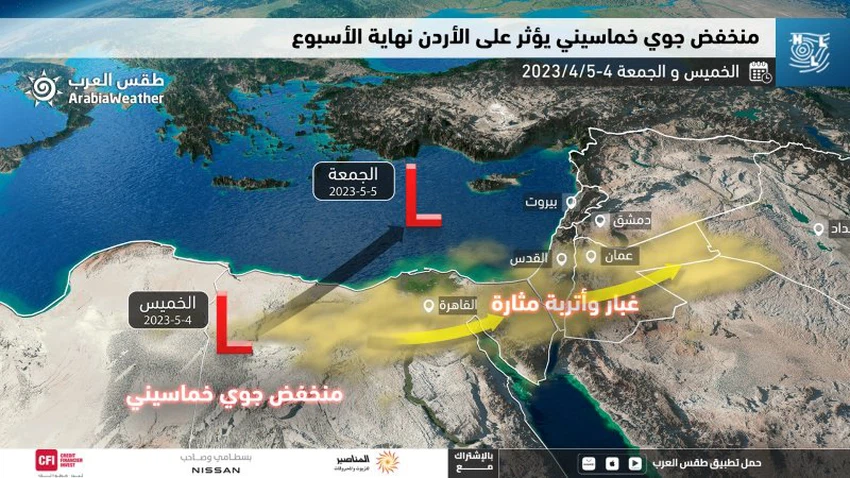 And the Kingdom continues to be affected during the day on Friday by the Khamasini depression, so that the Kingdom will prevail in Khamasini weather conditions, and the weather will be relatively hot, dry and dusty in several regions of the Kingdom, and hot in the regions of the Jordan Valley, the Dead Sea and Aqaba, and some high and medium clouds will appear. by sessions.