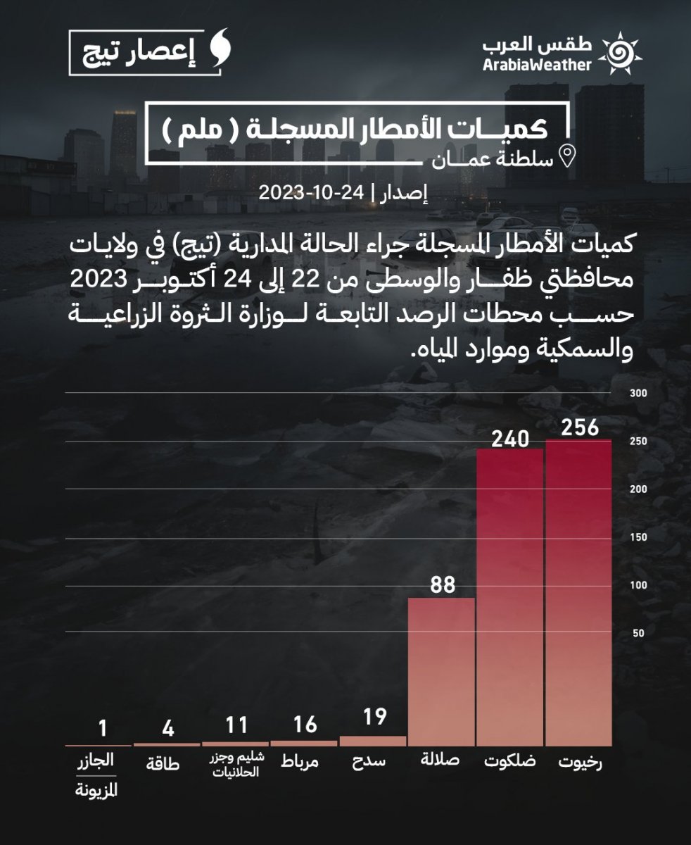 Cyclone Tej brought rains of varying intensity to the Sultanate, ranging from heavy to very heavy, specifically in the Dhofar Governorate and parts of the Al Wusta Governorate. The rain amounts were announced by monitoring stations affiliated with the Ministry of Agricultural Wealth, Fisheries and Water Resources, and are according to the graph shown in In the picture, the city of Rakhyut came in first place with the highest amount of rainfall, which was 256 mm.