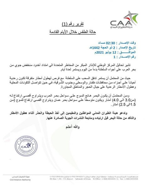 Arab Weather - Sinan Khalaf - As part of its continuous monitoring and follow-up of the developments of the tropical moisture flow from the Arabian Sea towards the Sultanate, the General Authority of Meteorology in the Sultanate of Oman issued Report No. 1 on the details of the airport forecast during the coming days, and the following is the text of the report: