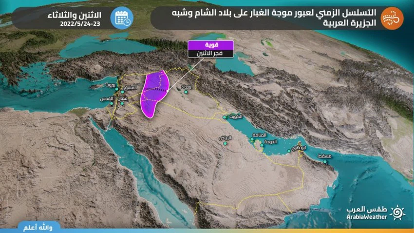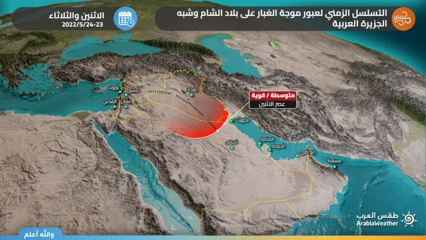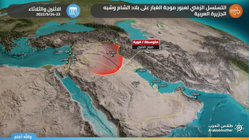 According to the computer simulation in "Arab Weather", it is expected that the dust wave formed earlier in the evening of Sunday will move in the southwest direction to directly affect western and parts of central and southern Iraq, including the capital, Baghdad, with the morning hours of Monday 23/5-2022 and decrease with it. The visibility is largely horizontal, as it requires extreme caution while driving on the roads, in conjunction with its continuing effects on parts of northeastern Saudi Arabia.