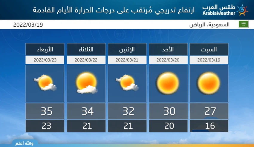 It is expected that the temperatures will decrease again at the beginning of next week, so that there will be great fluctuations in the atmosphere, and these are the characteristics of the transitional periods in the Kingdom and the rest of the region, God willing.