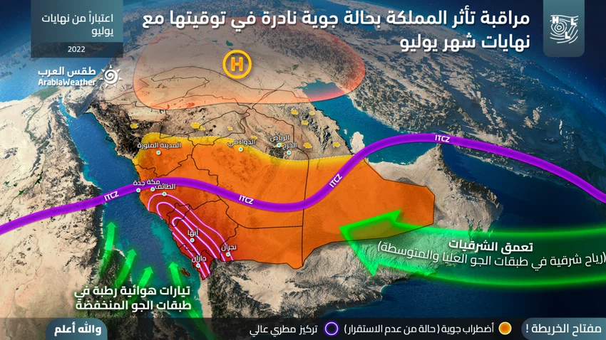 Specialists at the Arabian Regional Weather Center attributed the rare rains that fell in Riyadh on July 31, 2022 to unusual weather patterns that allowed large quantities of tropical moisture to flow in a rare manner from the Arabian Sea and the Horn of Africa region towards all the southern and central parts of the Arabian Peninsula. , including the capital, Riyadh.