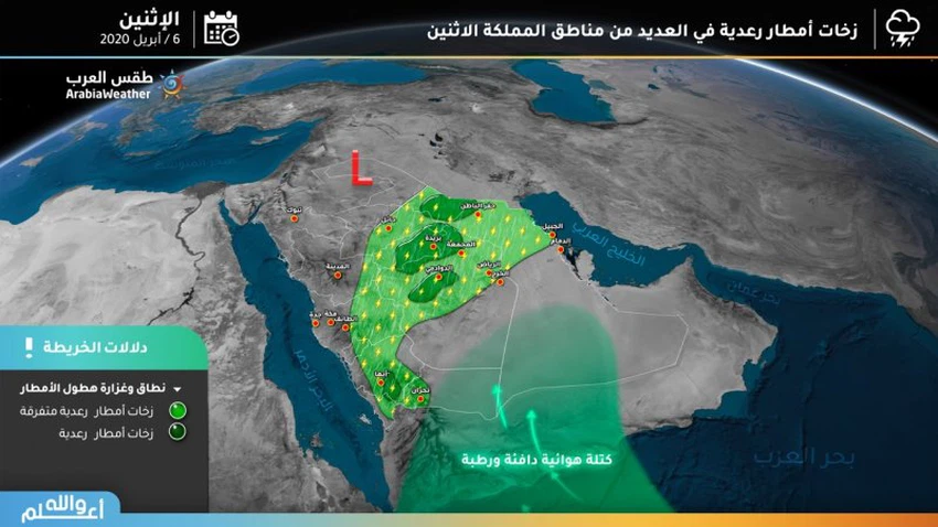 In the details, our latest weather forecasts in the Arab weather indicate an air depression centered over the southern part of Iraq today, Sunday, God willing, following which a warm and moist air mass will flow from the Arabian Sea and east of the African continent towards the central, eastern and southern regions of the Kingdom, what is working on the emergence of A state of air instability and rainfall.