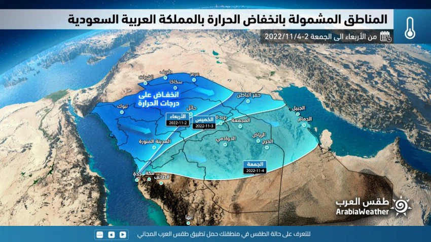 Weather of Arabia - The latest weather readings indicate expectations of a deepening of the autumn and temperate air mass for the central and eastern regions of the Kingdom on Friday, so that there will be a decrease in temperatures and become below their usual rates in those areas and surface humidity levels will rise in the atmosphere, especially during the night hours.