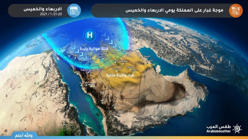 Weather of Arabia - Sinan Khalaf - strong winds and dust waves that may be the strongest since the beginning of the season, accompanied by extremely cold air mass, and extremely low temperatures, reaching zero degrees at night in large areas.