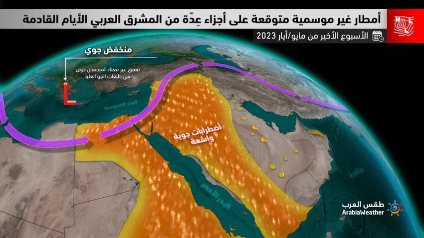 Weather of Arabia - The latest weather readings indicate that several countries of the Arab East, including the Kingdom of Saudi Arabia, are on a date with unusual weather disturbances at this time of the year, causing weather fluctuations that include chances of rain accompanied by thunderstorms and hail that may be dense in some regions, in addition to strong winds that lead to dusty waves, by the will of God Almighty.