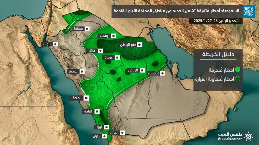 As for Monday, the opportunity for some scattered rain is expected to remain in parts of the central and eastern parts of the Kingdom, with the chances weakening and the weather tending to stabilize in the evening and night hours, God willing.