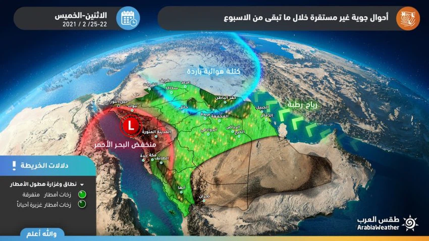 Weather of Arabia - Sinan Khalaf - large parts of the Kingdom of Saudi Arabia, God willing, during the remainder of this week remain under the influence of unstable weather conditions, as rainy thunder clouds are expected to continue to multiply in separate and random parts of the Kingdom, which may be accompanied by lightning and thunder sometimes , And may hail, and surface wind activity.