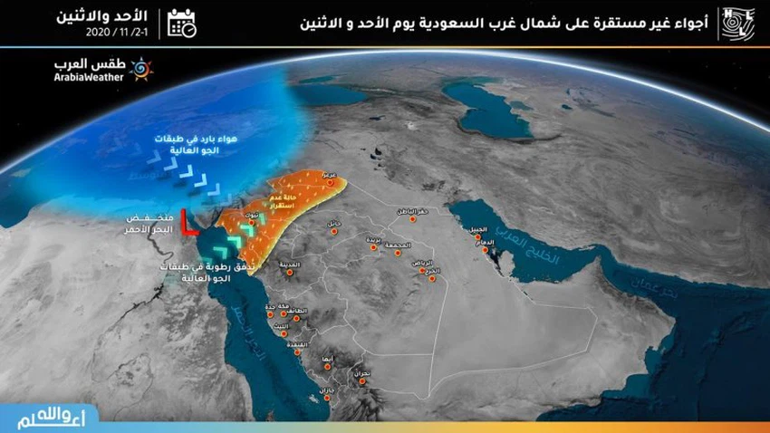 It is expected that, God willing, the unstable weather conditions on the coasts of the Tabuk region will start from Saturday evening, so that high and medium clouds begin to multiply, and the opportunity will gradually arise for separate thunderstorms from rain, and from the hours of Sunday evening and Sunday / Monday night, it is expected that the situation will intensify Air instability on the coasts of Tabuk region, extending towards some of its internal parts, in addition to parts of Al-Jawf and the northern border region.