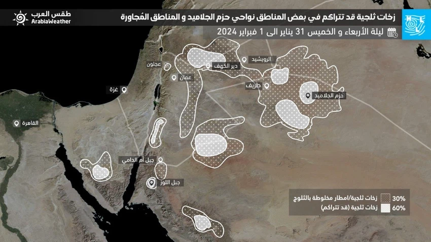 Chances of snow will also be present in the areas of Kilwa and the border areas with Jordan located northeast of Tabuk, and Jabal al-Lawz may also include some snowfalls.
