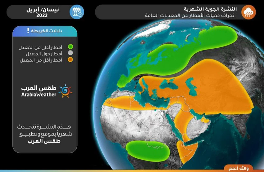 In contrast to the daily weather forecast, these bulletins focus on listing the general weather during a month, where the aim is to know the deviation of rainfall amounts and temperatures from their general rates. Many meteorologists in the world are busy trying to decipher the mystery of making accurate seasonal forecasts by conducting many researches in this regard, in which the Arab Weather team participates in part.