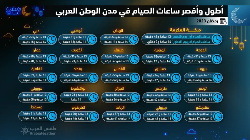 Weather of Arabia - The number of fasting hours in the month of Ramadan varies between countries of the world according to the geographical location of each country, and in Ramadan this year 2023 AD / 1444 AH, the shortest hours of fasting in the world will be in countries located south of the equator, because the number of daylight hours is now less in the southern half of the globe, while the longest hours of fasting will be in countries far north.