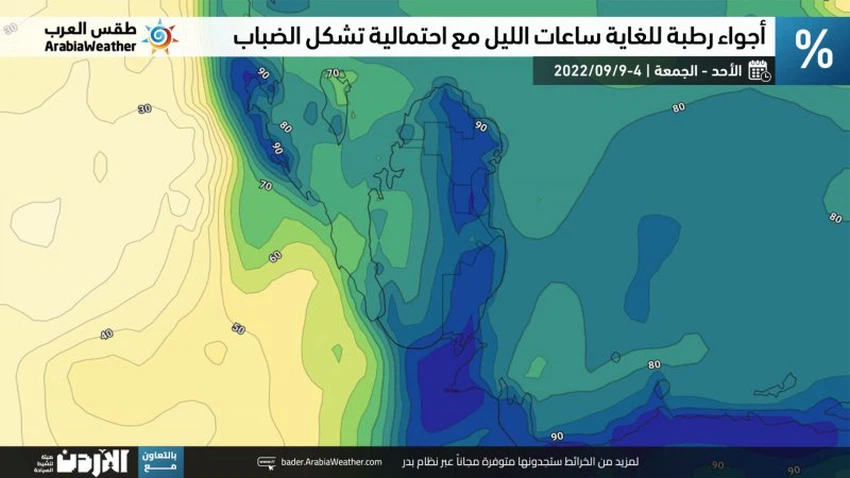 During the night hours, the weather is relatively hot with a noticeable rise in surface humidity, and the opportunity is created with the dawn and early morning hours to form fog and light fog in parts of Qatar, especially the southern ones, and the winds will be easterly light to moderate in speed.