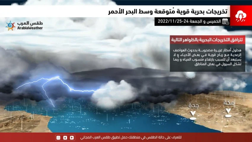 According to the latest weather readings, it is expected that the less hot air will gradually deepen with the night hours (Wednesday/Thursday night) to the center of the Red Sea and meet it with a rush of warm air from the south, as a result of which marine graduations will form in the middle of the Red Sea and directly affect the coasts of Medina and South of Tabuk, which leads to heavy thunderstorms with strong winds in some neighborhoods, and it is not excluded that it will cause a rise in the water level and may form torrents, and it is expected that rain clouds will gradually affect several parts of the coasts of Makkah Al-Mukarramah, especially at dawn and Thursday morning, coinciding with With medium rains interspersed with heavy showers sometimes in parts of Tabuk and Medina and the west of the northern borders, causing valleys to flow and forming torrents in some areas, in addition to being accompanied by the occurrence of thunderstorms, especially in the western sector of the Kingdom.