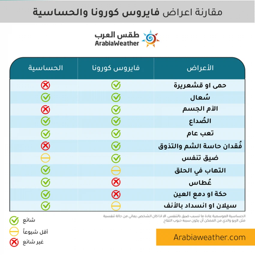 Where the Arab Weather team prepared a special infographic explaining the difference between them to help distinguish between seasonal allergies and the Corona epidemic: