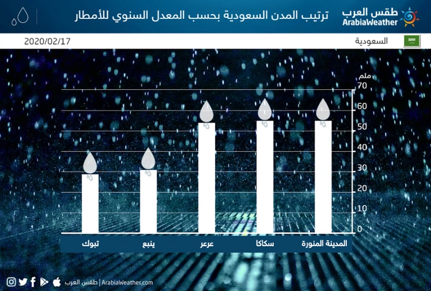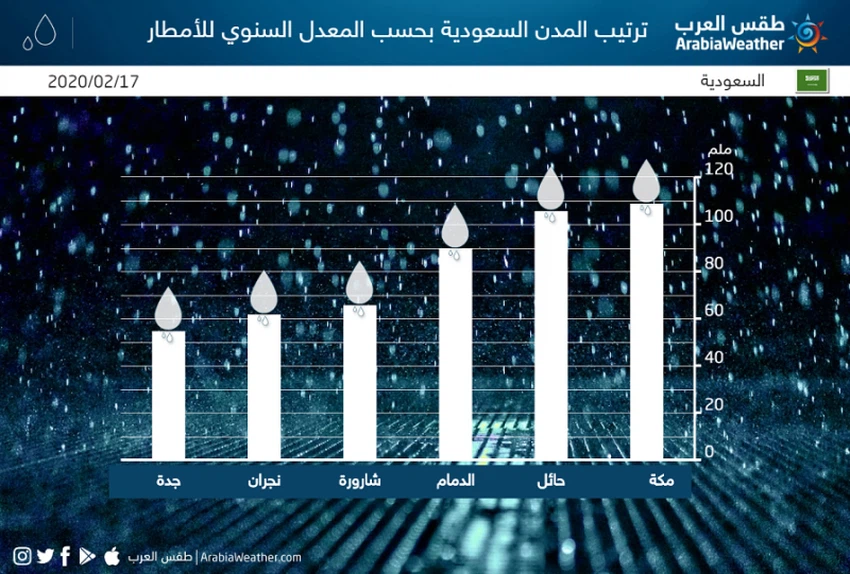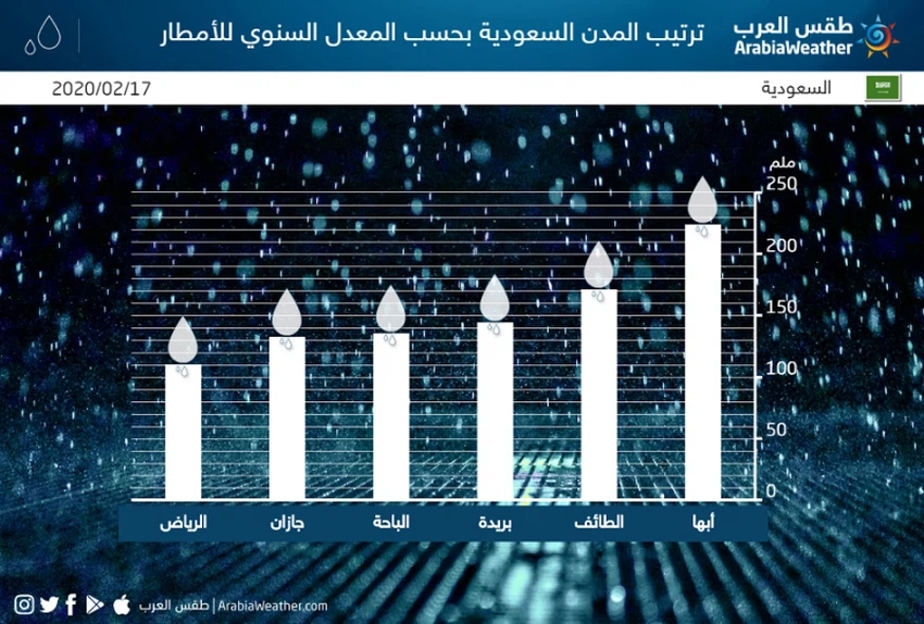 In our next report, we highlight the ranking of Saudi cities according to the average annual rainfall amounts , according to the statistics for the period 1982 to 2011: