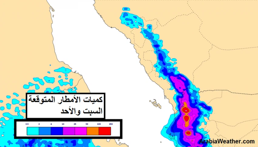 وترتفع احتمالات تشكل السيول خلال هذه الفترة (أي نهار السبت والأحد)، حيث تشير الخرائط الجوية الى توقع تساقط 10-30 ملم من الأمطار خلال ساعات النهار والعصر بمشيئة الله بحيث تكون الامطار غزيرة كلما اتجهنا جنوباً.