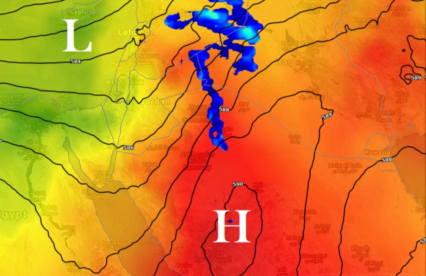 وهذا يؤدي الى الدفع بتيارات هوائية رطبة من الجنوب الغربي في طبقات الجو المتوسطة نحو شمال المملكة، مما يساعد على تكاثر السحب الركامية، وتساقط زخات رعدية من الأمطار.