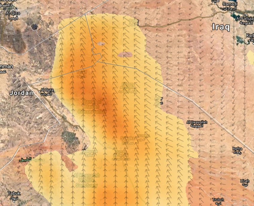 كما تشير التوقعات الى هبوب رياح جنوبية نشطة السرعة على منطقة الجوف وطريف نهار يوم الأحد، تؤدي الى اثارة الغبار والاتربة بشكل قوي وتدني مدى الرؤية الافقية لأقل من 1000 متر.