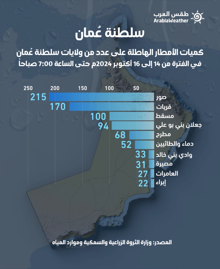 The Ministry of Agriculture, Fisheries and Water Resources in the Sultanate published the distribution and quantities of rainfall in the Sultanate during the period from October 14 to 16, 2024 AD.