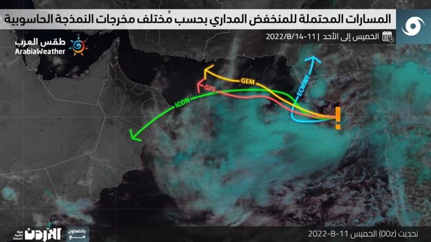 While the outputs of other numerical models indicate its movement towards the Sea of Oman, bringing with it some rainy cumulus clouds to the Sultanate of Oman. Also, some other outputs indicate that the tropical depression has moved directly to the Omani lands, which makes the region vulnerable to being affected by high amounts of rain, but this possibility is the weakest due to the small number of products that sense this path.
