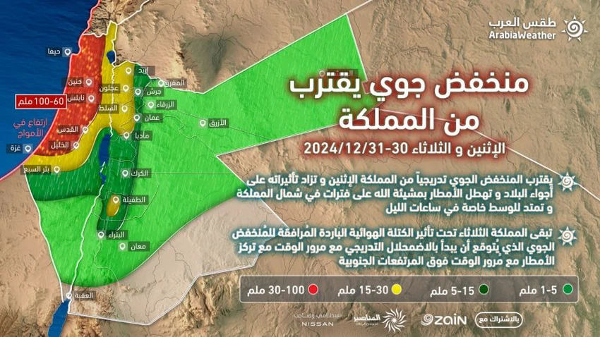 Arab Weather - The low pressure system located south of the Turkish territories has begun to move towards the southeast to gradually approach the Kingdom, and its effects will increase in an ascending manner starting from the late hours of this night, Sunday/Monday, as it is expected, God willing, that the weather tonight will turn to become changeable between partly cloudy and cloudy, and the opportunity for rain will gradually become available in parts of the north and center of the Kingdom.