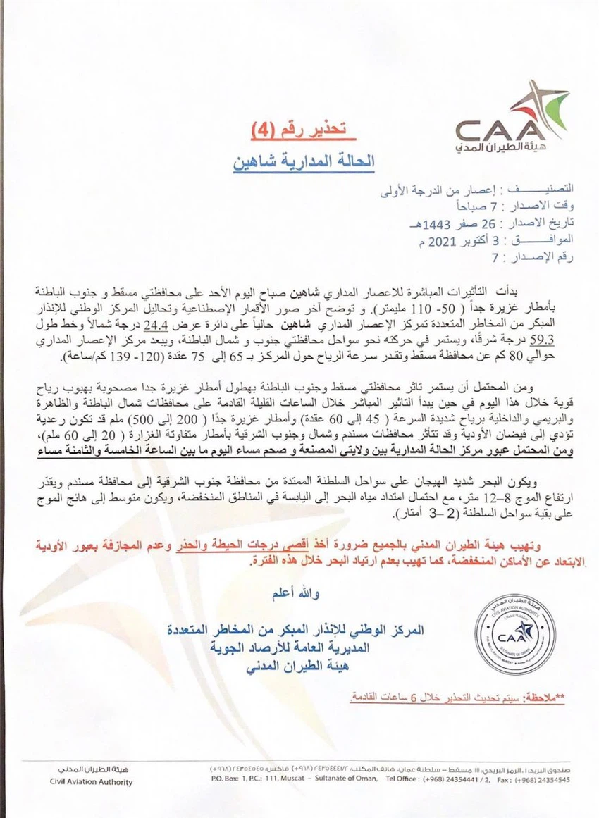 Arab weather - The Meteorological Authority in the Sultanate of Oman issued a short while ago Warning No. 4 about the developments of tropical cyclone Shaheen in the Arabian Sea, and the following is the text of the statement: